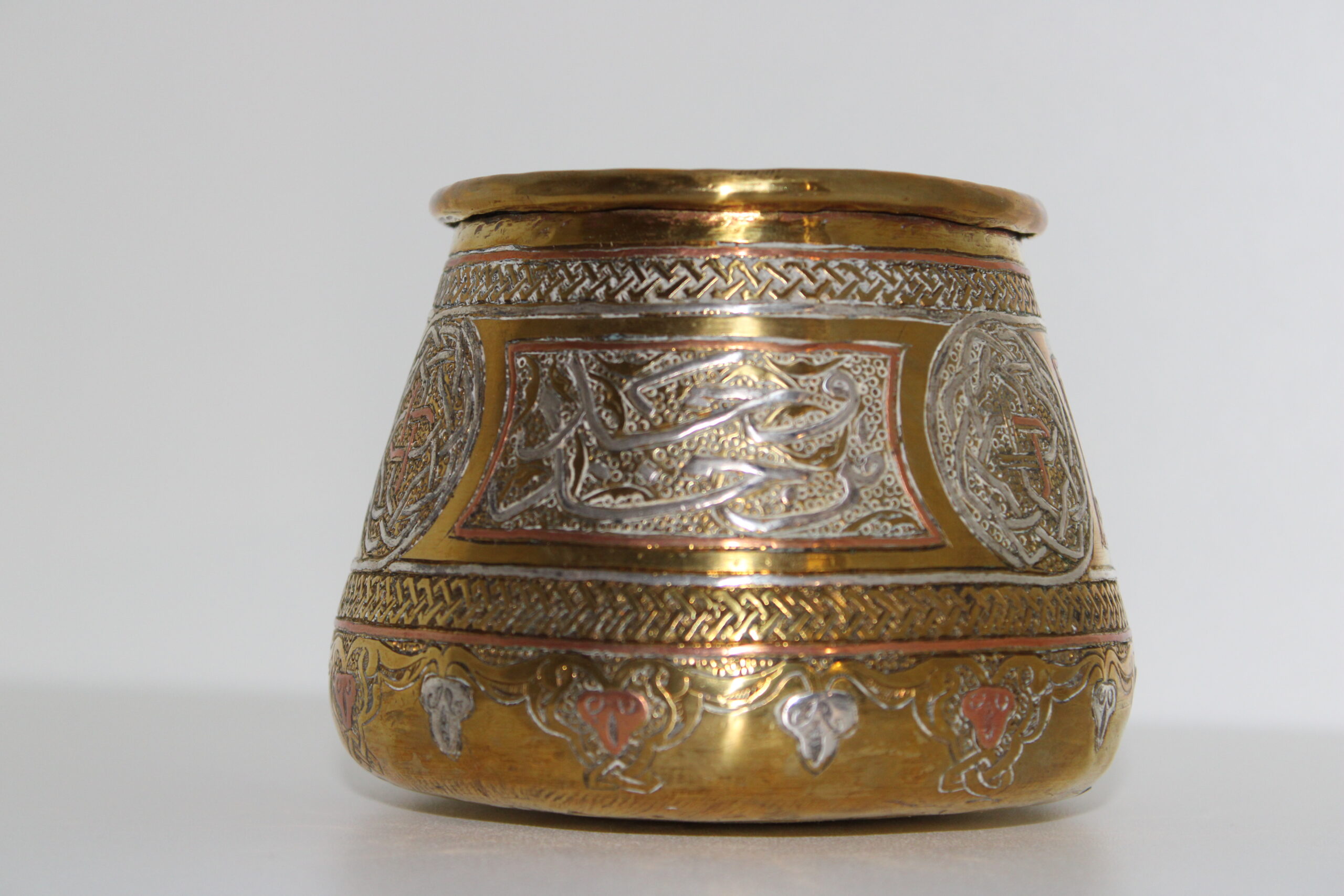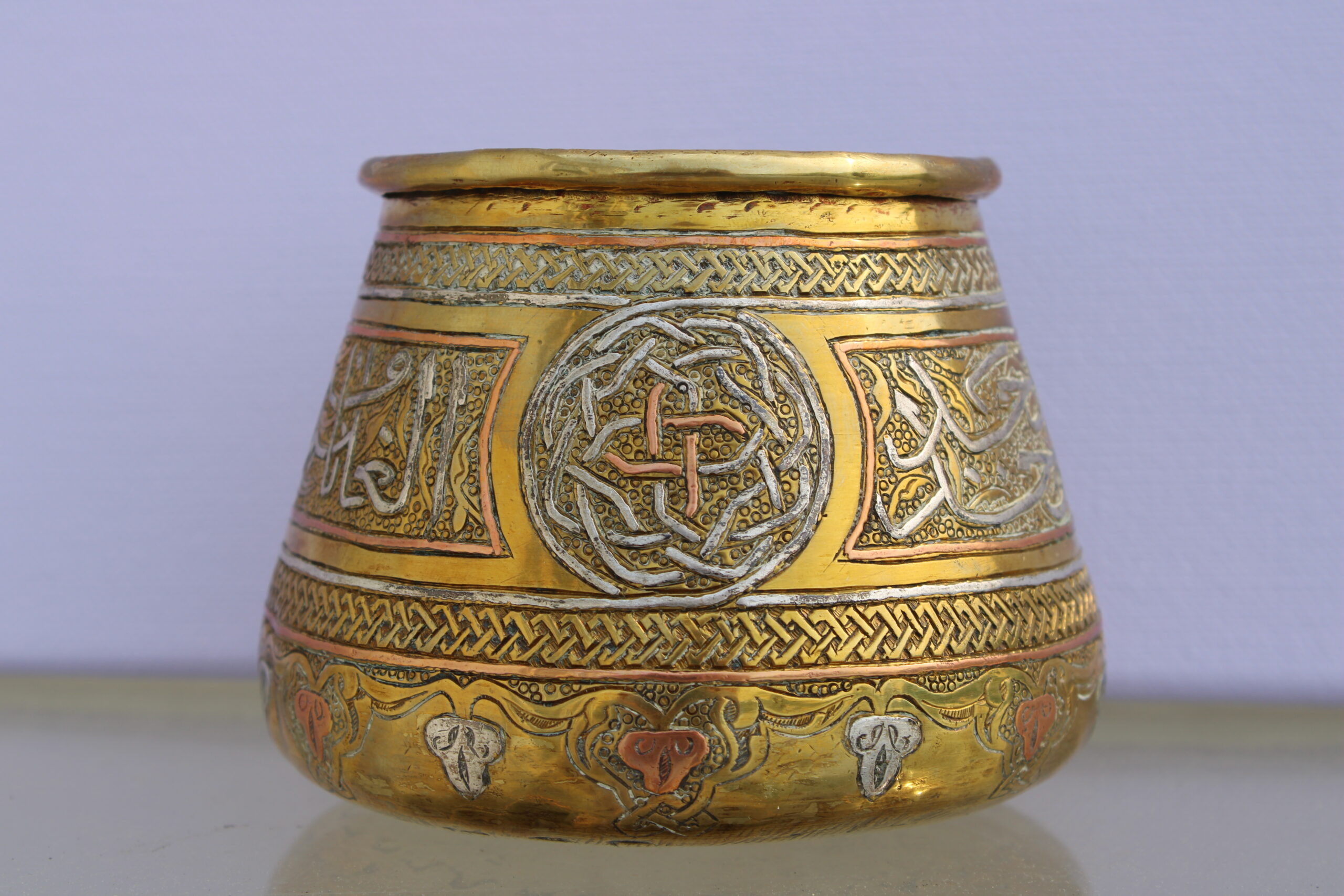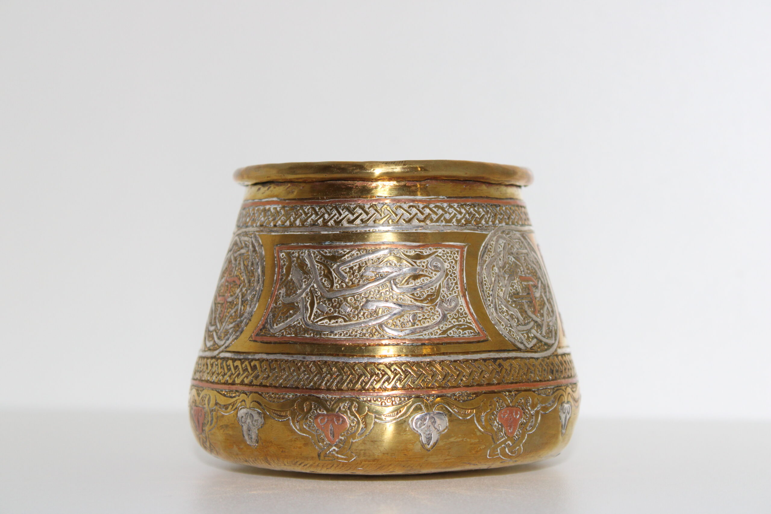 typische Form, eingelegt mit Silber und Kupfer mit Blumenmuster, oben und unten kalligrafische Bänder/Schriftzüge