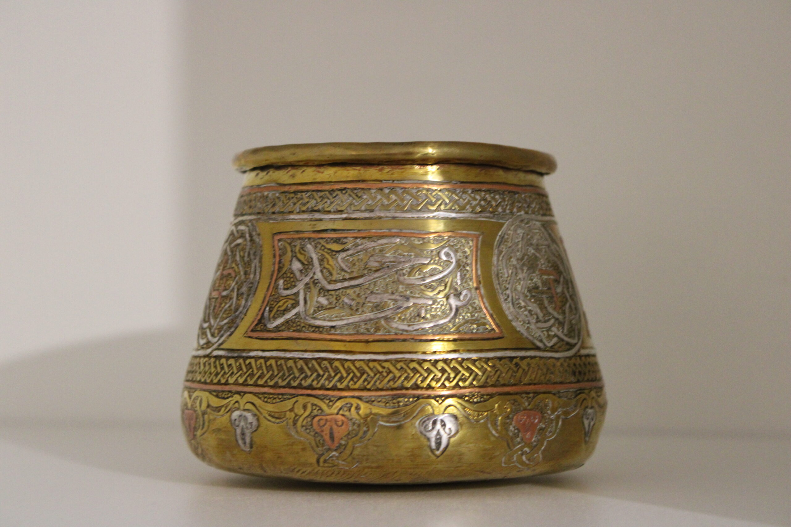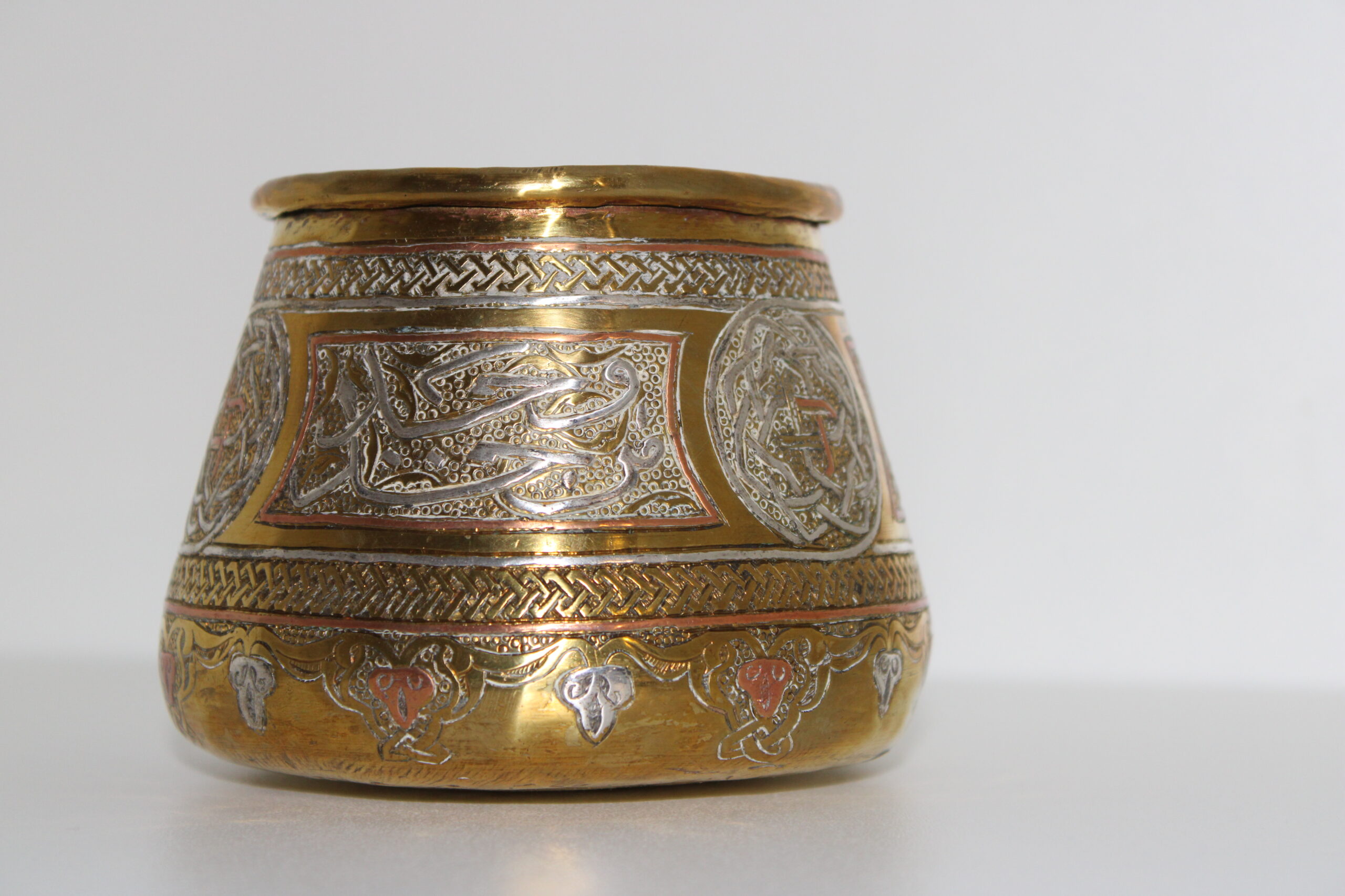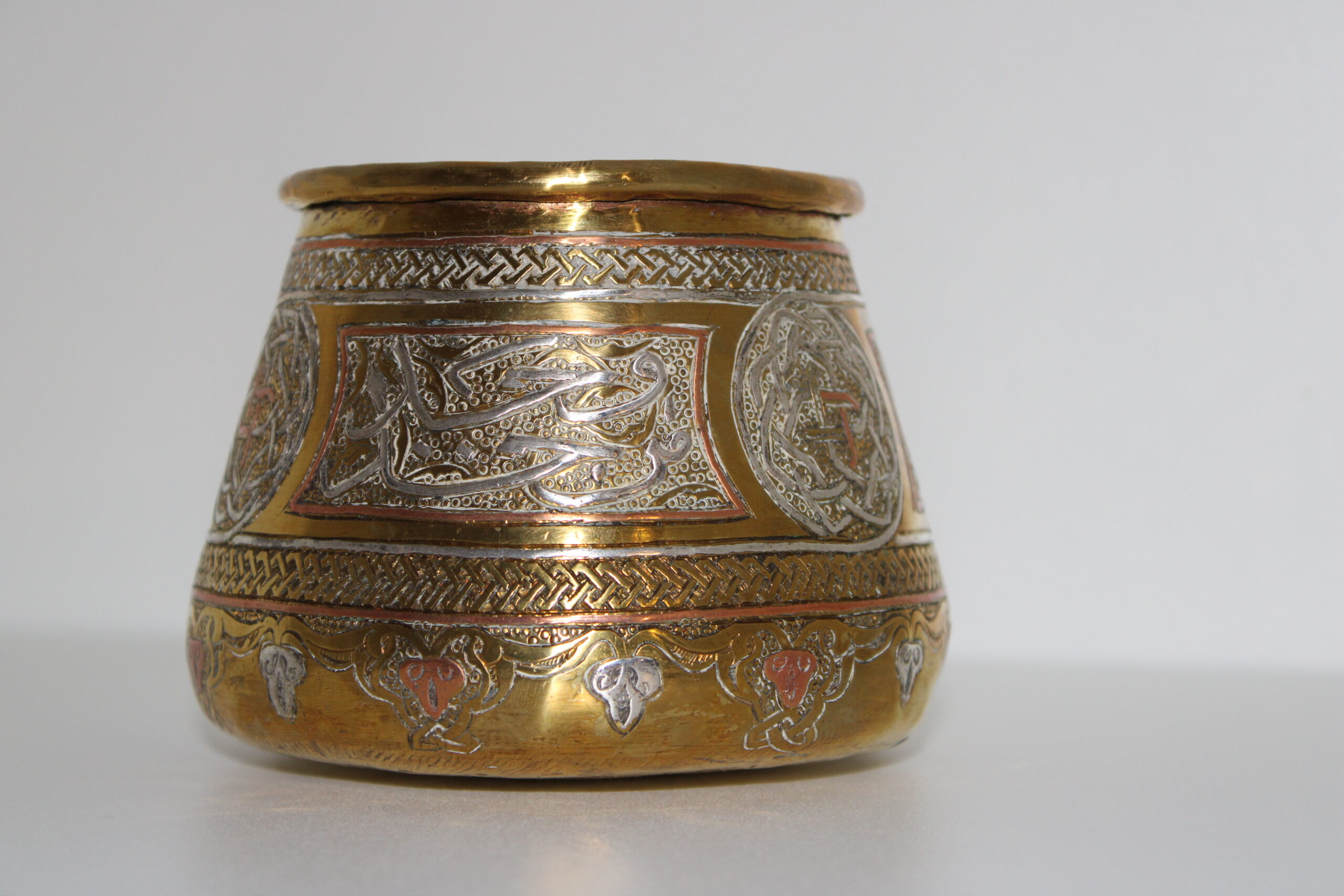 typische Form, eingelegt mit Silber und Kupfer mit Blumenmuster, oben und unten kalligrafische Bänder/Schriftzüge